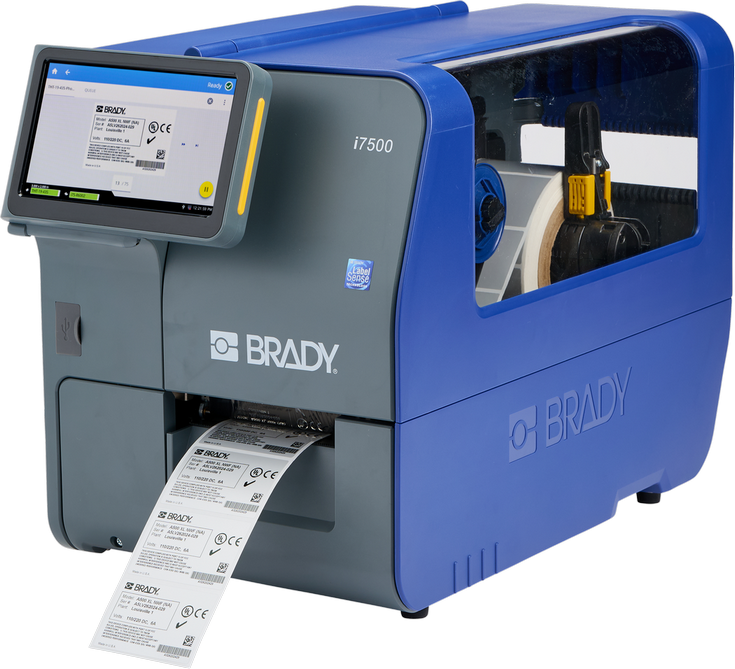 i7500 lämpösiirtotulostin; korkean suorituskyvyn tarratulostusta ennenäkemättömällä helppoudella. Tarramateriaalien vaihdot 40 sekunnissa ilman säätöjä, testitulostuksia ja hukkatarroja. LabelSense™-teknologia mahdollistaa tulostimen, Brady i75-Series -tulostusmateriaalien ja Brady-ohjelmiston välisen kommunikoinnin, automatisoiden ja poistaen työläät säädöt ja tarroja tuhlaavat työvaiheet.